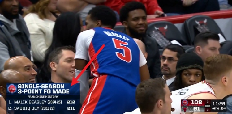 54場(chǎng)212記!馬利克-比斯利單賽季212記三分榮登隊(duì)史第一 貝排第二