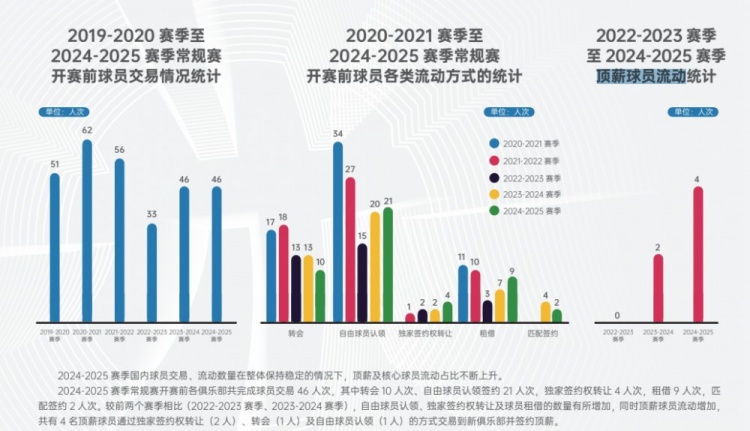 配簽約2人次。較前兩個賽季相比(2022-2023賽季、2023-2024賽季),自由球員認(rèn)領(lǐng)、獨家簽約權(quán)轉(zhuǎn)讓及球員租借的數(shù)量有所增加,同時頂薪球員流動增加,共有4名頂薪球員通過獨家簽約權(quán)轉(zhuǎn)讓(2人)、轉(zhuǎn)會(1人)及自由球員認(rèn)領(lǐng)(1人)的方式交易到新俱樂部并簽約頂薪。