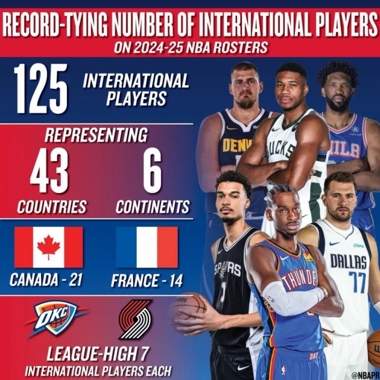 最近幾年趨勢發(fā)生了轉(zhuǎn)向。2017/18賽季,還有2023/24和2024/25賽季,以NBA揭幕戰(zhàn)的時間點統(tǒng)計,國際球員的數(shù)量都達到了歷史最高的125人,占聯(lián)盟球員數(shù)量的1/4了。