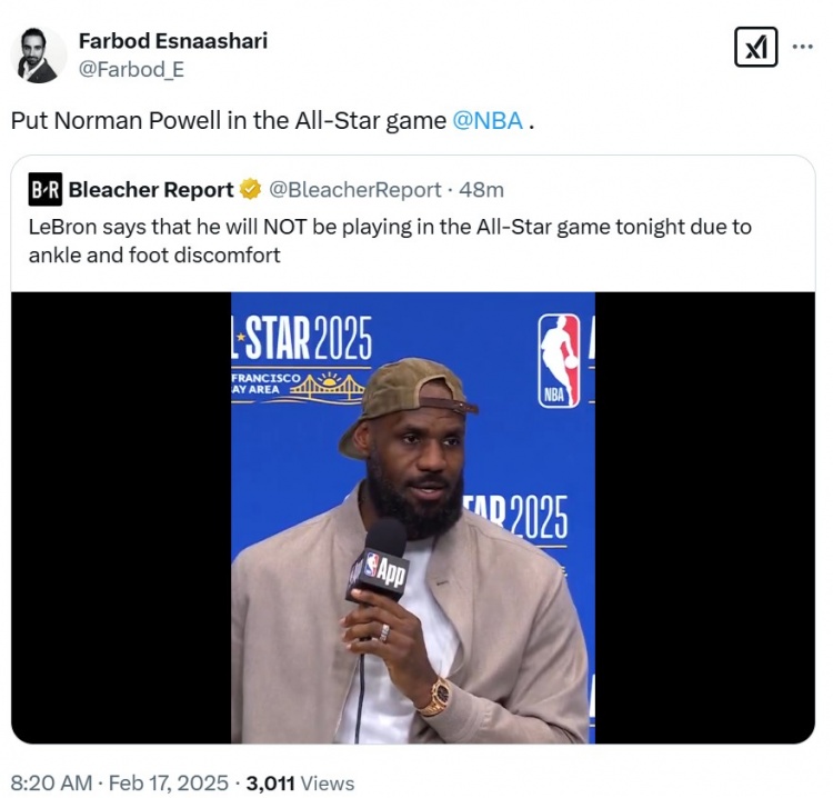 對(duì)此,快船隊(duì)記Farbod Esnaashari轉(zhuǎn)發(fā)視頻評(píng)論道:“NBA官方,讓鮑威爾進(jìn)全明星吧。”