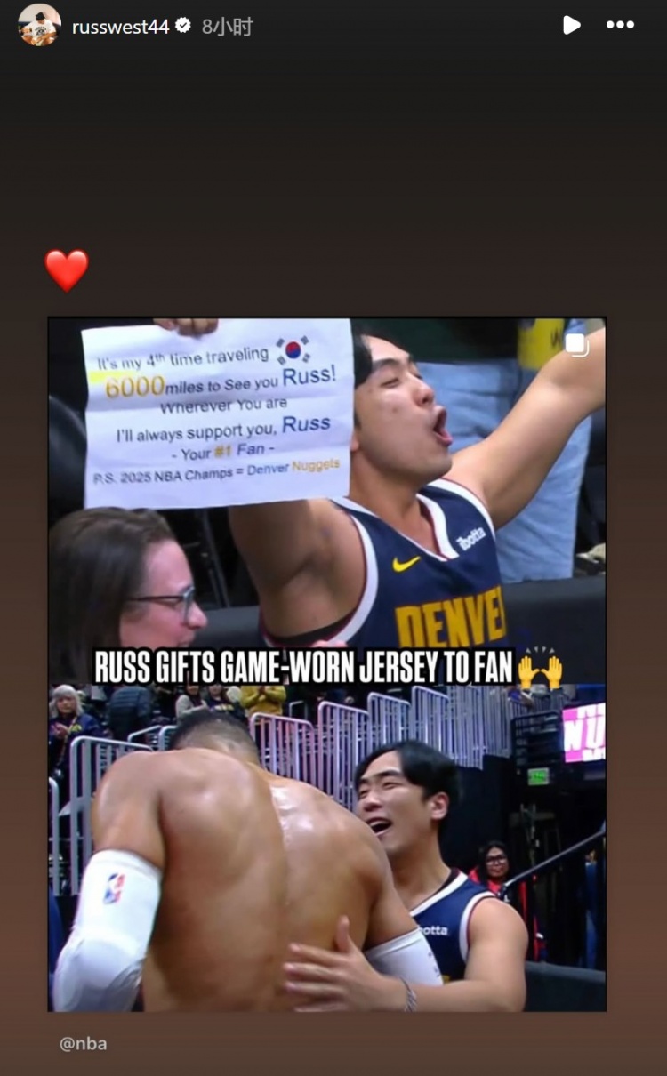 威少賽后也是將球衣送給了這位球迷,他還轉(zhuǎn)發(fā)了這個瞬間,并評論道:“??。”