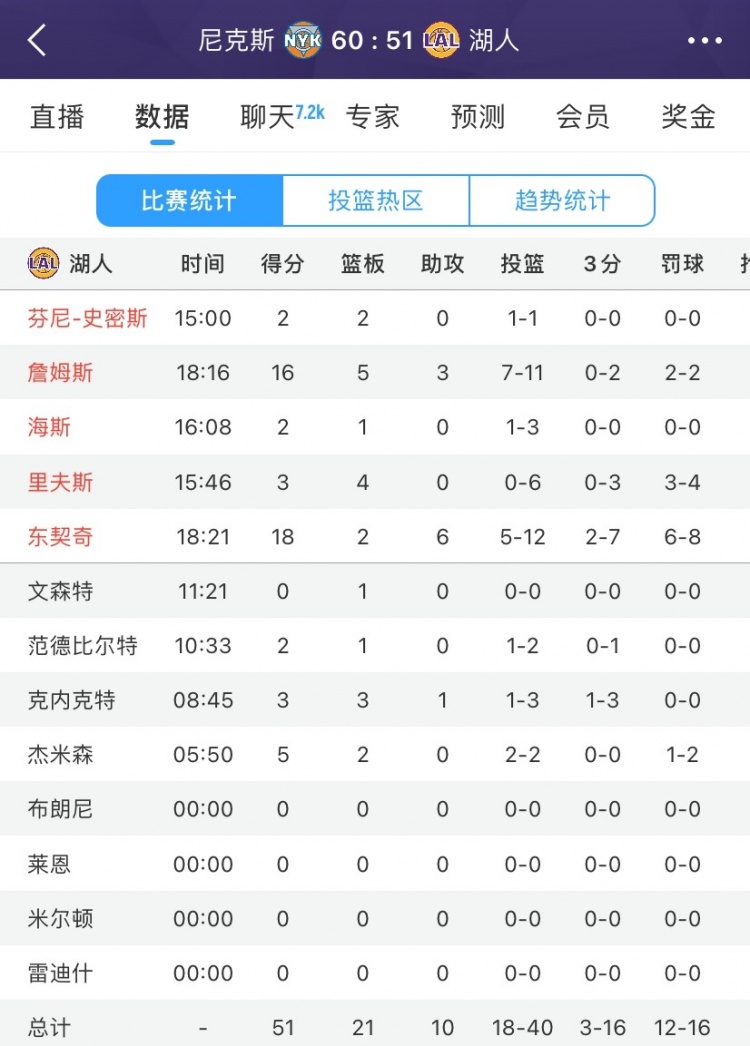 3月7日訊 NBA常規(guī)賽,湖人半場51-60落后尼克斯。上半場比賽,湖人外線投射不在線,射手也不準,全隊16投僅3中,命中率僅18.8%:東契奇7中2,克內(nèi)克特3中1,詹姆斯2中0,里夫斯3中0,范德比爾特1中0。 本文標簽: NBA 籃球 湖人 詹姆斯 東契奇