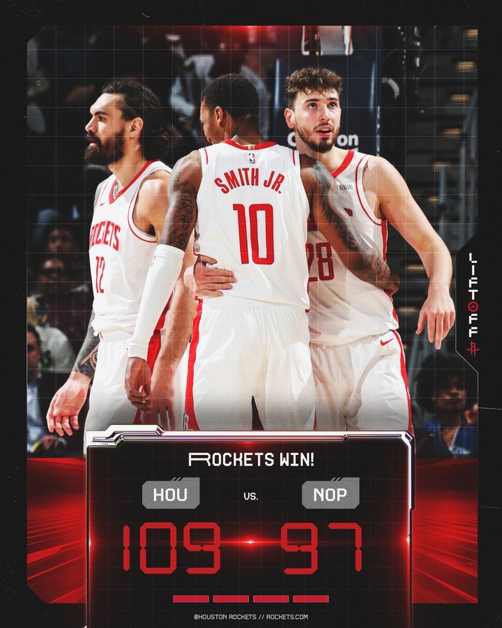 賽后,火箭官方曬出本場(chǎng)贏球海報(bào),申京、亞當(dāng)斯和小賈巴里登上封面。