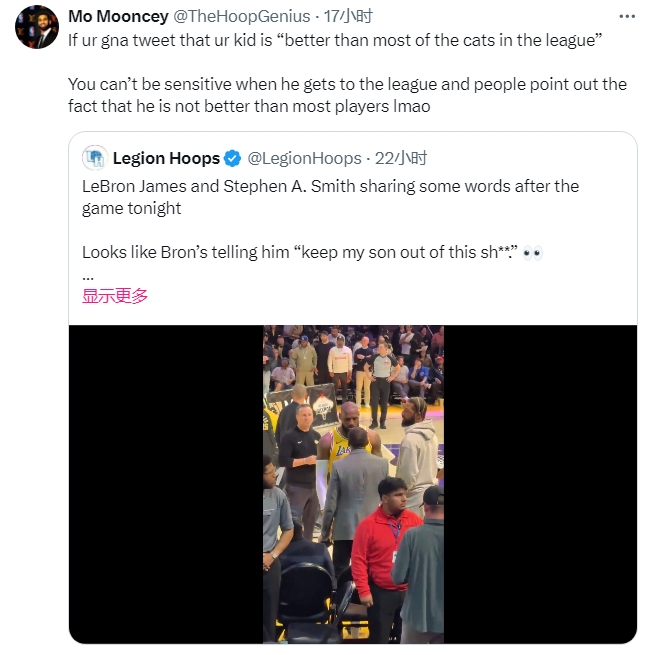 賽后,詹姆斯找到A史密斯對峙,詹姆斯表示:“老子不在乎,兄弟!不要把我兒子扯進來,兄弟!”