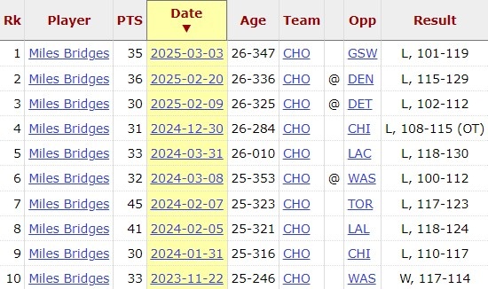 3月8日訊 NBA常規(guī)賽,黃蜂117-118惜敗騎士。此役,邁爾斯-布里奇斯打了39分鐘32投15中,三分10中4、罰球13中12空砍全場(chǎng)最高46分外加8籃板2助攻2搶斷,46分生涯新高!值得一提的是,邁爾斯-布里奇斯在過去10場(chǎng)拿到30+的比賽全輸了。 本文標(biāo)簽: NBA 籃球 黃蜂