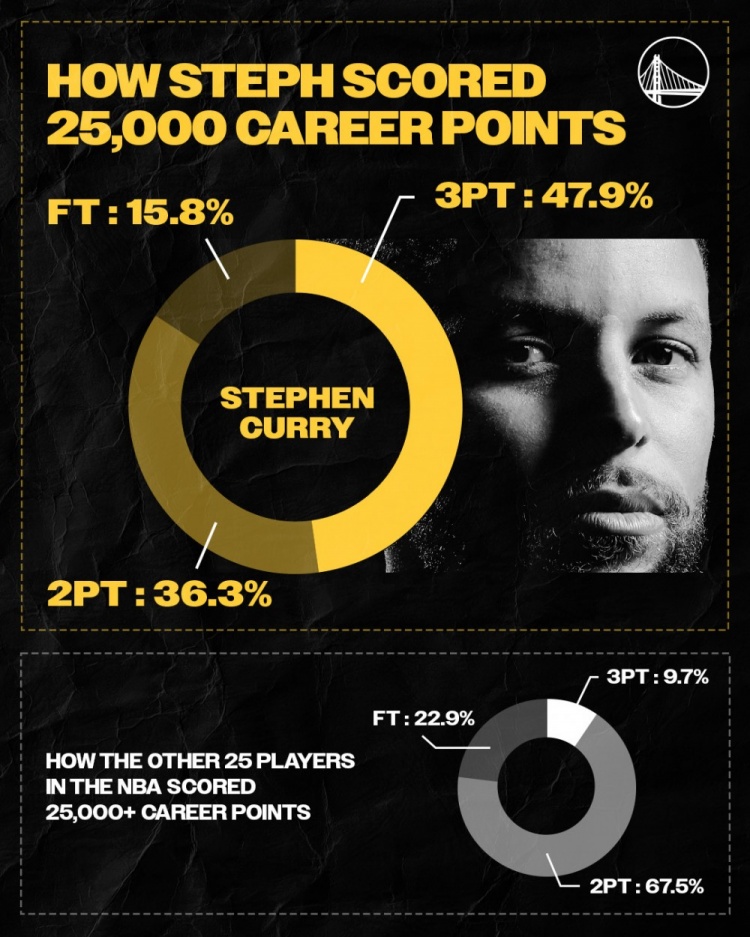 庫(kù)里25000分得分方式占比:兩分36.3%,三分47.9%,罰球15.8%;聯(lián)盟歷史上其他25位得分超25000的球員:兩分67.5%,三分9.7%,罰球22.9%。 本文標(biāo)簽: 籃球 NBA 勇士 庫(kù)里