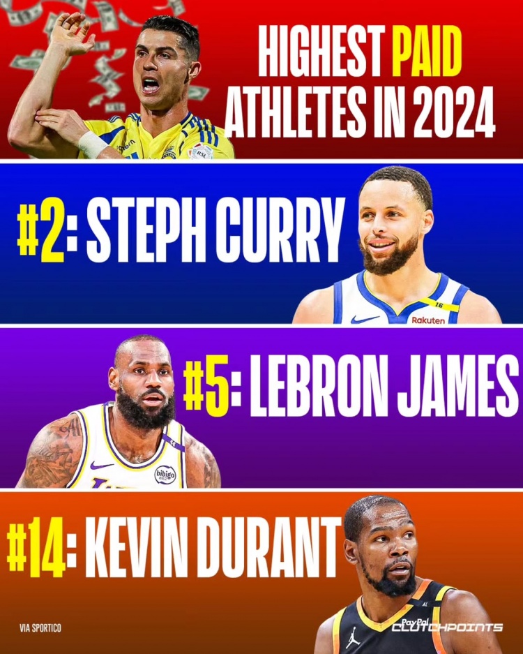 3月10日訊 美媒《Sportico》公布2024年年收入最高的運動員排行,其中,庫里第二僅次于C羅,詹姆斯第五,詳情如下: