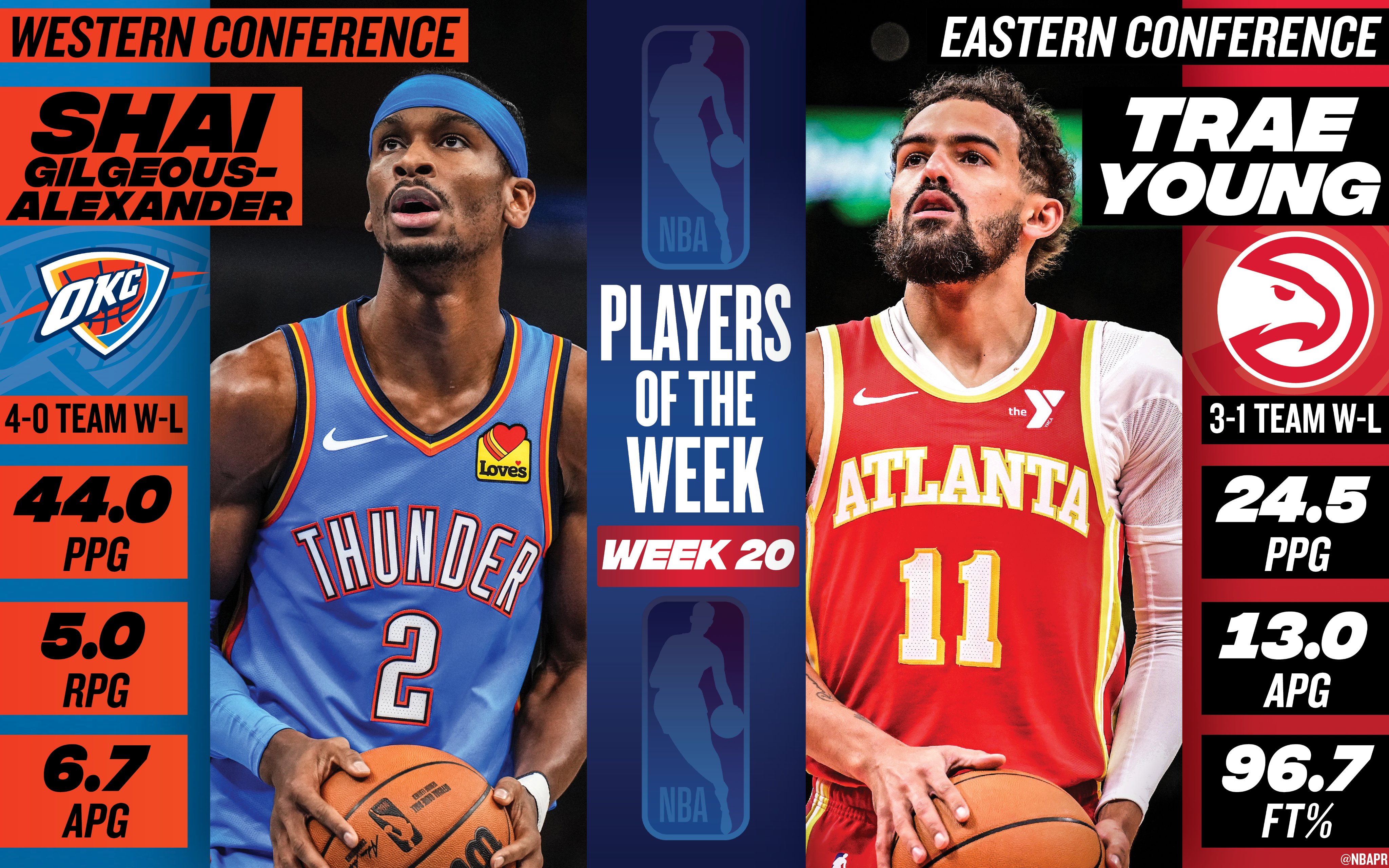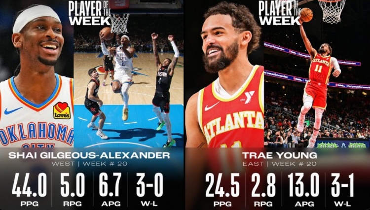 3月11日訊 今日NBA官方宣布,老鷹后衛(wèi)特雷-楊和雷霆后衛(wèi)亞歷山大分別被評(píng)為2024-25賽季第20周東西部周最佳球員。