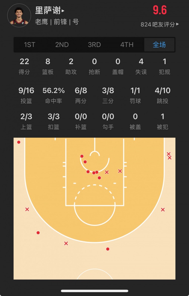 老鷹狀元秀 扎卡里-里薩謝 登場(chǎng)31.3分鐘