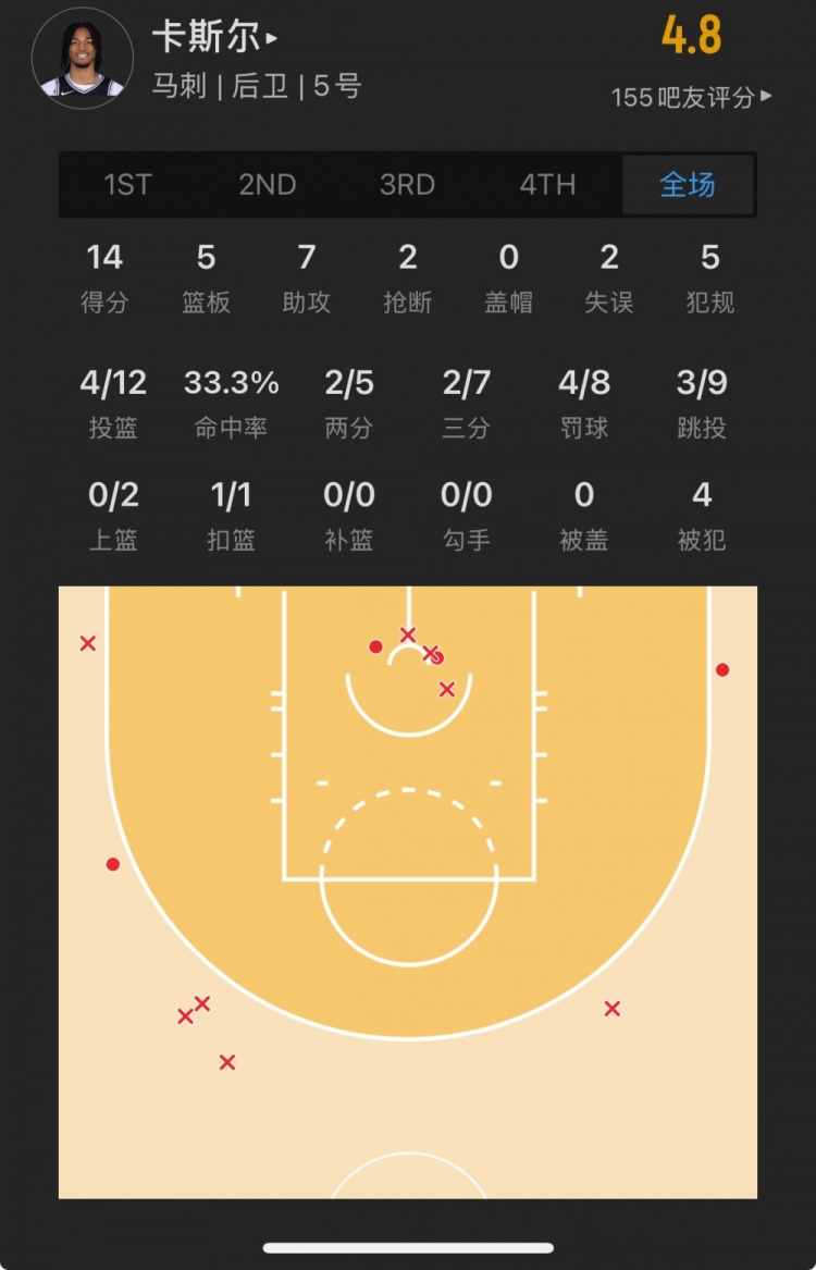 馬刺4號(hào)秀 斯蒂芬-卡斯?fàn)?登場(chǎng)29.6分鐘
