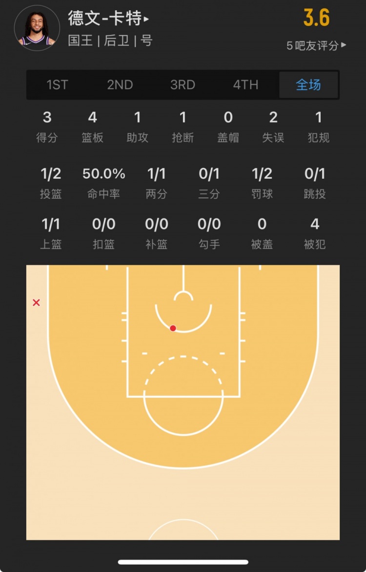 國(guó)王13號(hào)秀 德文-卡特 登場(chǎng)12.5分鐘