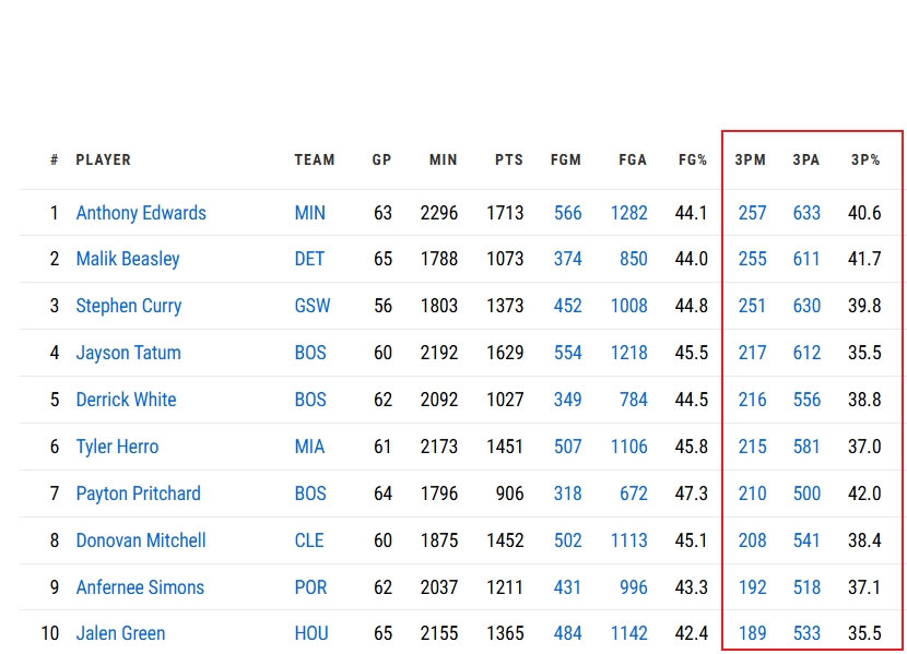 聯(lián)盟三分榜,愛德華茲繼續(xù)位居榜首(257記),比斯利排名第二(255記),庫(kù)里今日之后超越250記,三分總數(shù)來(lái)到251記,迅速逼近。