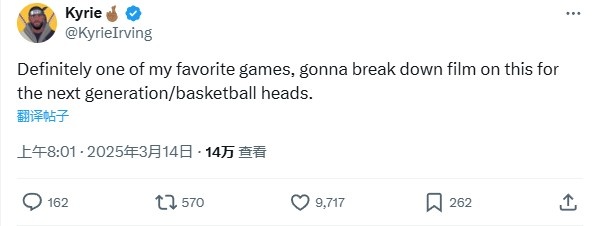 美媒寫道:“5年前的今天(2020年1月31日),歐文31分鐘砍下54分,僅投丟了4個球?!睔W文則回復道:“這絕對是我最喜歡的比賽之一,我會為下一代(球員)/球迷們解析這場比賽?!?/p>