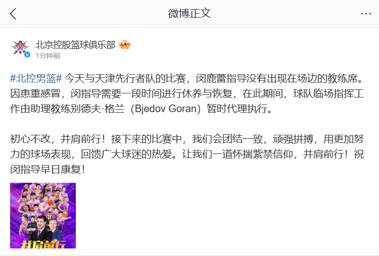 03月15日訊 北控男籃官宣:因患重感冒,閔指導(dǎo)需要一段時間進(jìn)行休養(yǎng)與恢復(fù),在此期間,球隊臨場指揮工作由助理教練別德夫·格蘭(Bjedov Goran)暫時代理執(zhí)行。 本文標(biāo)簽: 籃球 CBA 中國籃球 北控