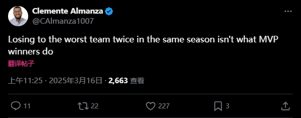 賽后,雷霆記者Clemente Almanza發(fā)推寫道:“同一個(gè)賽季兩次輸給聯(lián)盟最差的球隊(duì),這可不是MVP該有的表現(xiàn)哦?!?/p>