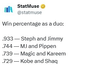 3月16日訊 NBA常規(guī)賽,勇士97-94力克尼克斯,豪取7連勝。至此,庫里和巴特勒共同出戰(zhàn)的比賽戰(zhàn)績?yōu)?4勝1負(fù),勝率高達(dá)93.3%。美媒則曬出三組傳奇搭檔勝率進(jìn)行對比:喬丹+皮蓬——74.4%魔術(shù)師+賈巴爾——73.9%科比+奧尼爾——72.9% 本文標(biāo)簽: 籃球 NBA 勇士 庫里 巴特勒 喬丹 科比 奧尼爾
