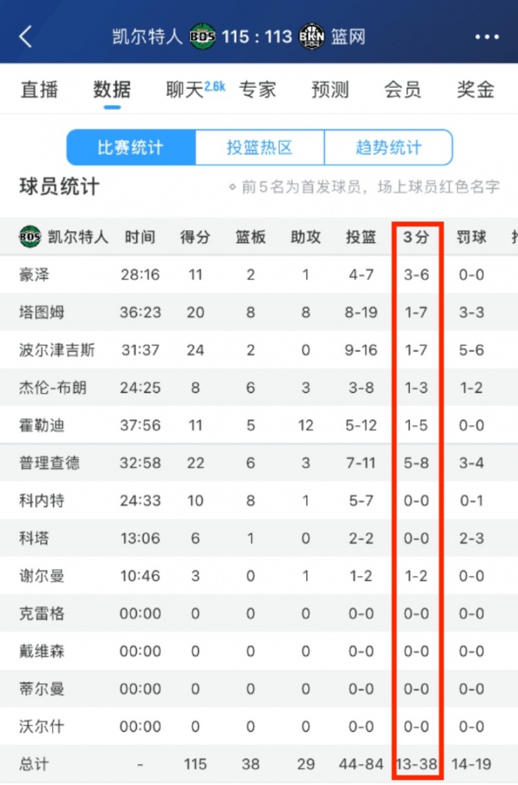3月16日訊 NBA常規(guī)賽,凱爾特人115-113險勝籃網。本場比賽,凱爾特人全隊三分整體來說有些失準,38投13中,命中率僅34.2%;除了普理查德(8中5)和豪澤(6中3)正常發(fā)揮外,其余人皆失常,僅24中5。 本文標簽: 籃球 NBA 凱爾特人