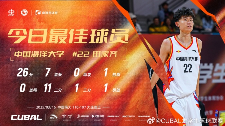 在今日的比賽中,大前鋒田家齊以26分7籃板的狂暴表現(xiàn),率領(lǐng)中國(guó)海洋大學(xué)110-107力克大連理工,彌補(bǔ)去年全國(guó)賽6分落敗的遺憾。這位身披22號(hào)戰(zhàn)袍的內(nèi)線(xiàn)猛獸,用籃下9投7中的高效終結(jié)鑿穿對(duì)手禁區(qū)。其5個(gè)進(jìn)攻籃板直接轉(zhuǎn)化為二次進(jìn)攻得分,恰是去年那場(chǎng)失利留下的成長(zhǎng)的痕跡。當(dāng)技術(shù)統(tǒng)計(jì)表上“0失誤”與“57%真實(shí)命中率”冰冷陳列,這位大前鋒用最熾熱的方式完成了對(duì)過(guò)去的回首:去年遺憾落敗的夜晚,他掩面落淚;今夜,他成了親手拆解對(duì)手的禁區(qū)判官。