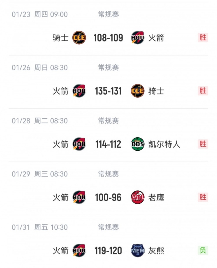 1月31日訊 NBA常規(guī)賽,火箭119-120不敵灰熊。在過去5場(chǎng)比賽中,火箭每場(chǎng)比賽分差都不超過4分,期間火箭4勝1負(fù)。 本文標(biāo)簽: 籃球 NBA 火箭