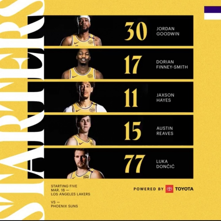 3月17日訊 今日,湖人官方賽前公布了本場比賽的首發(fā)陣容。東契奇、里夫斯、古德溫、芬尼-史密斯、海斯將首發(fā)出場。湖人將于3:30主場迎戰(zhàn)太陽。 本文標簽: 籃球 NBA 湖人