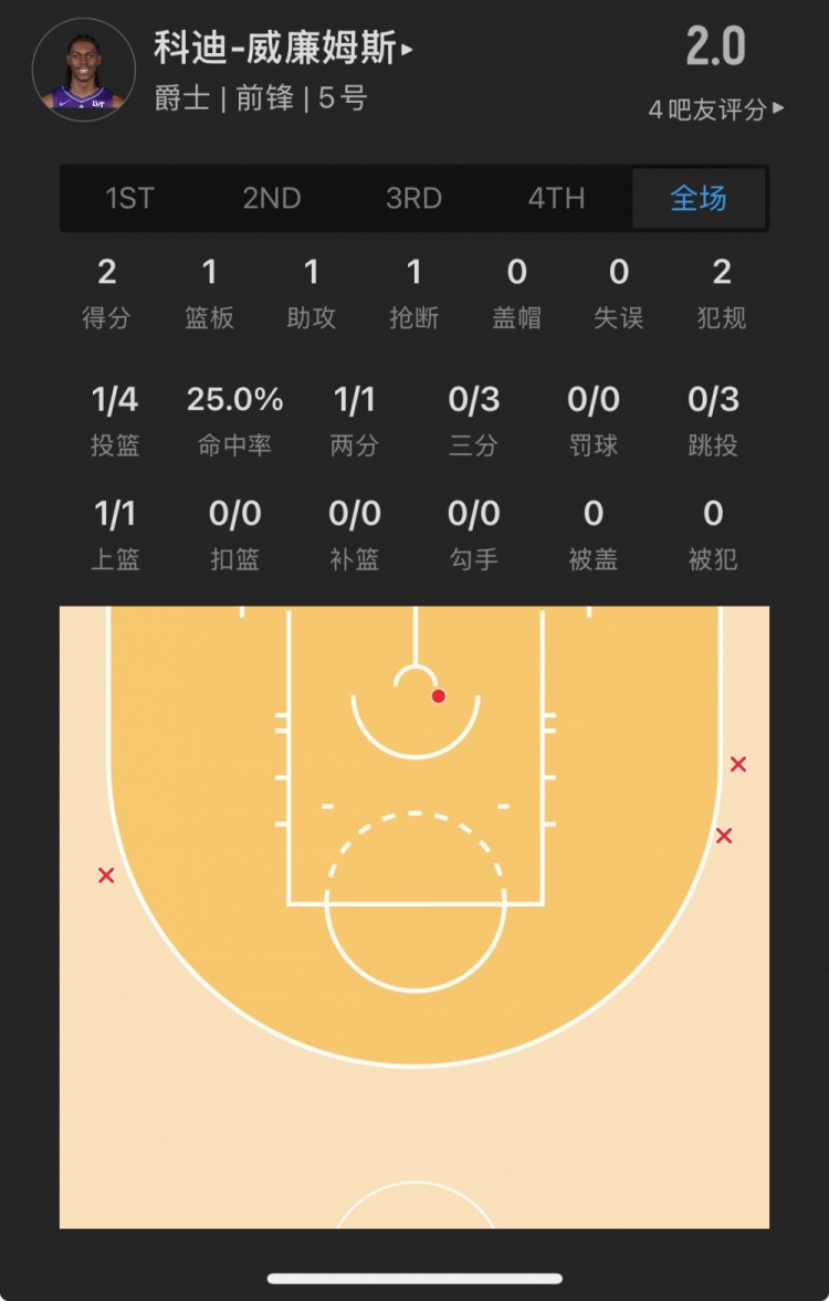 爵士10號秀 科迪-威廉姆斯 登場19.6分鐘