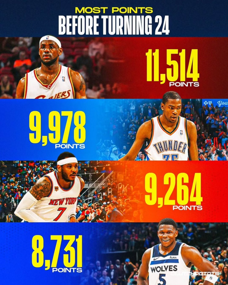 球星24歲前得分榜:華子8731登第4 詹姆斯斷檔第1 KD甜瓜分列2、3