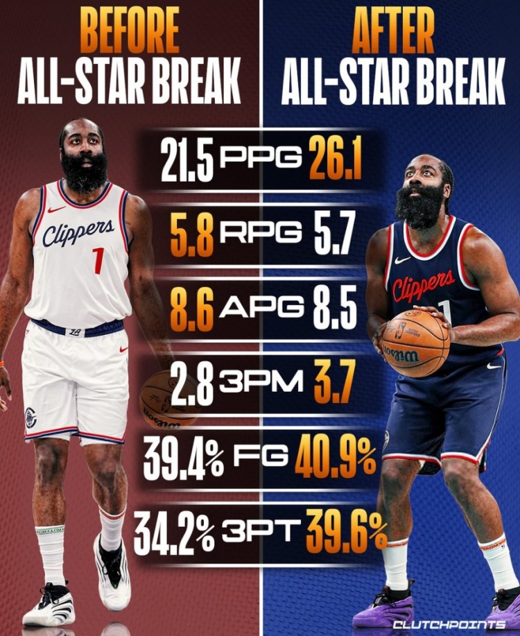 哈登全明星后場(chǎng)均26.1分5.7板8.5助 得分命中率皆有明顯上漲