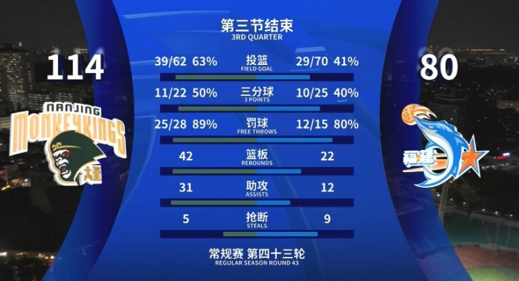 3月21日訊 CBA常規(guī)賽,同曦三節(jié)過后114-80大比分領先福建。同曦前三節(jié)進攻端全面開花,不僅配合流暢,手感也是相當火熱。全隊投籃命中率達到63%,62投39中,其中三分球22投11中,命中率達到50%,罰球28罰25中,全隊搶下42個籃板,比福建多20個,全隊助攻31次,比對手多19次。 本文標簽: 籃球 CBA 中國籃球 同曦 福建