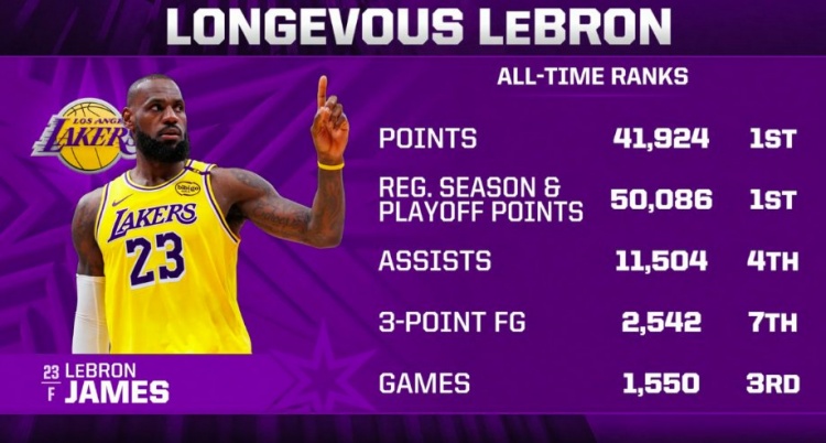 老詹41924分歷史第一;常規(guī)賽+季后賽50086分第一;總助攻11504第4;總?cè)置?542個(gè)歷史第7;出戰(zhàn)1550場(chǎng)歷史第3 本文標(biāo)簽: NBA 籃球 湖人 詹姆斯