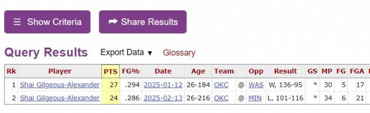 根據(jù)數(shù)據(jù)統(tǒng)計(jì),亞歷山大今天的命中率(24.1%)是賽季至今的最低,本場(chǎng)比賽之前,SGA有過(guò)兩場(chǎng)命中率低于3成的比賽,一場(chǎng)是對(duì)陣奇才17中5(29.4%),一場(chǎng)是對(duì)陣森林狼21中6(28.6%)。