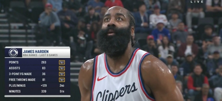 過去9場哈登263分、83助、命中36記三分、罰中81球皆聯(lián)盟第一;總正負(fù)值+129第二,出戰(zhàn)339分鐘第五