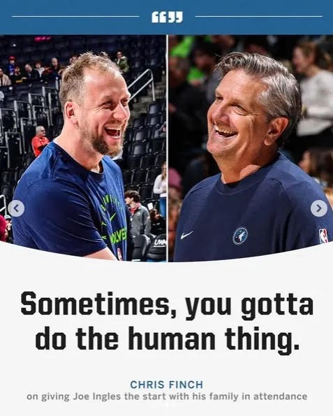 事實(shí)上芬奇也是當(dāng)天早上才決定這樣做的。有人跟他說,如果森林狼能夠在今晚的比賽中取得大比分領(lǐng)先,在大局已定的情況下讓英格爾斯上場會(huì)顯得很酷,既是對(duì)英格爾斯和他兒子的鼓勵(lì),也有助于凝聚球隊(duì)的士氣。