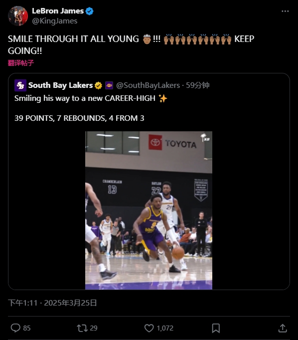 - 笑逐顏開!詹姆斯表揚(yáng)布朗尼:保持微笑&繼續(xù)前進(jìn)!加油王子!