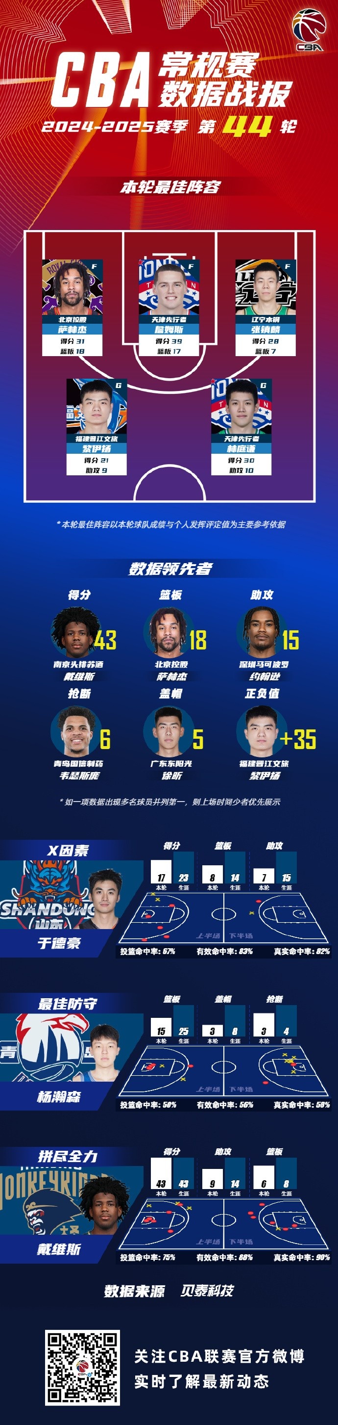 數(shù)據(jù)領(lǐng)先者方面:南京同曦籃球俱樂部球員戴維斯以單場43分的數(shù)據(jù)領(lǐng)銜得分榜;