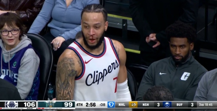 看著都疼!科菲接球順下撞到防守球員摔倒 鼻血直流