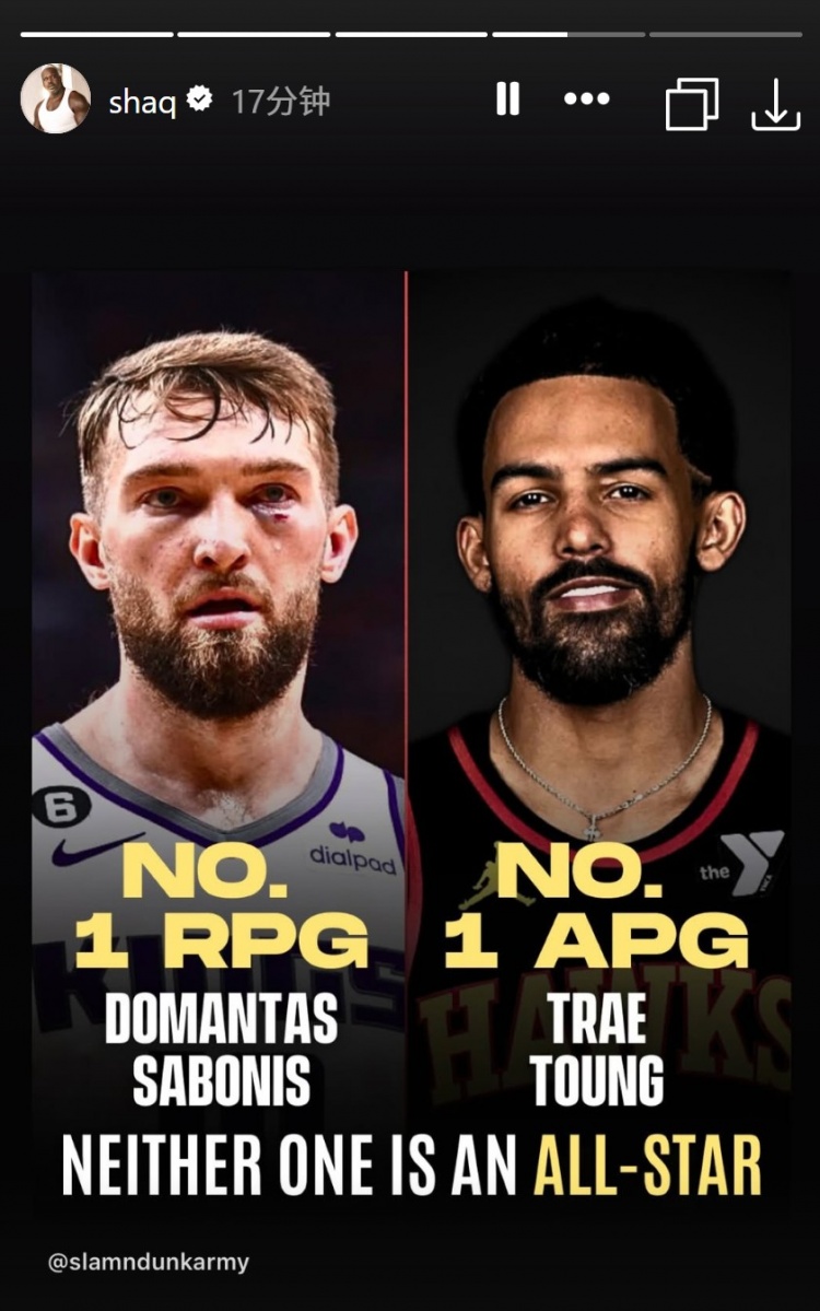 - 鳴不平?!奧尼爾轉(zhuǎn)發(fā):籃板王小薩和助攻王特雷-楊都無(wú)緣全明星