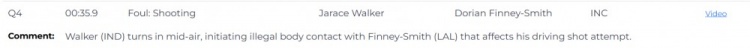 比賽最后35.9秒,湖人118-119落后一分,步行者球員賈雷斯-沃克防守時半空中轉身,與芬尼-史密斯發(fā)生非法身體接觸,影響了后者的上籃出手,此為犯規(guī)漏吹,芬尼-史密斯應該獲得兩罰。