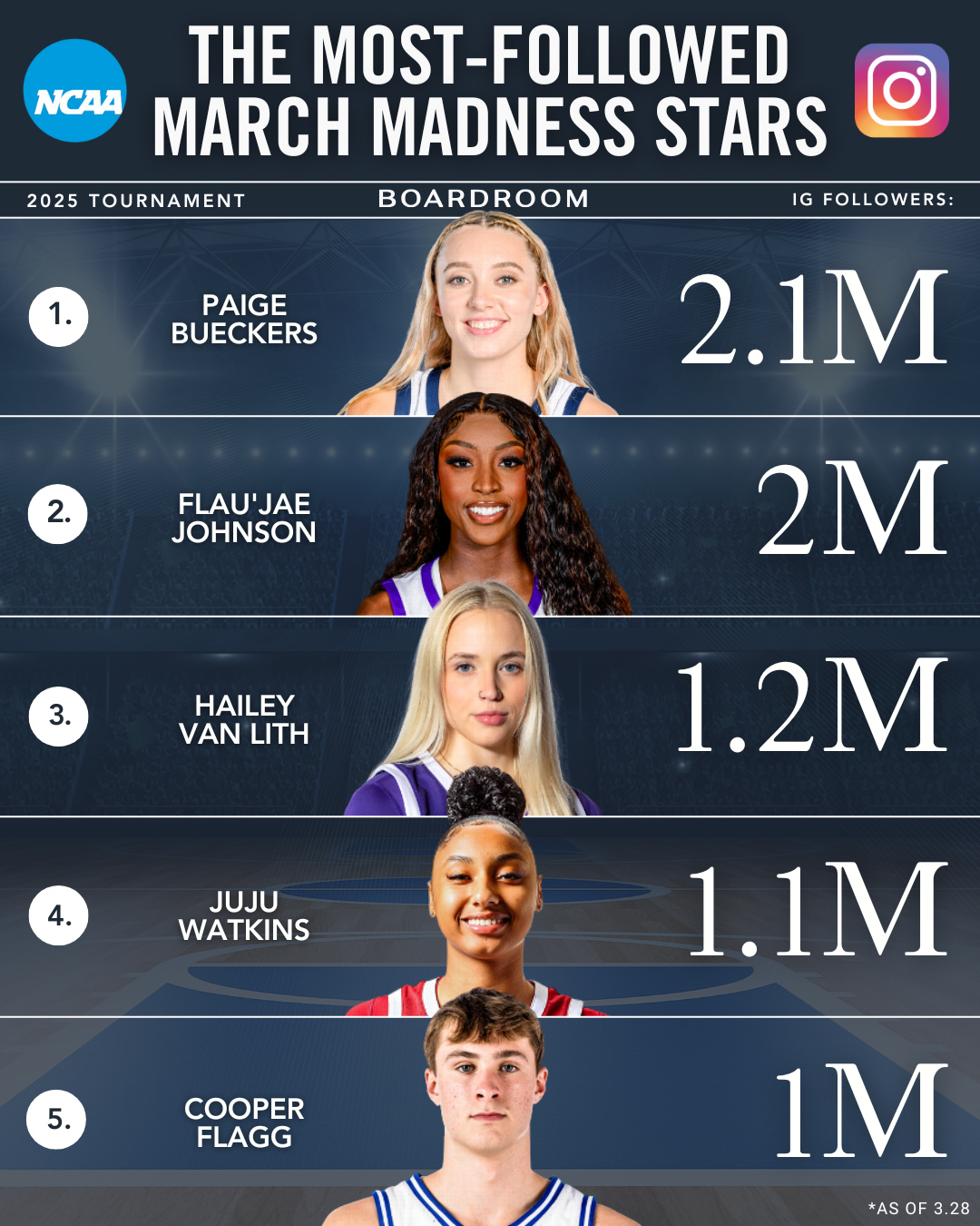 03月30日訊 美媒Boardroom今日統(tǒng)計了本屆NCAA瘋?cè)騿T的Instagram粉絲排名,NBA狀元大熱弗拉格以100萬粉絲排名第5,粉絲數(shù)“僅為”WNBA狀元大熱佩奇-布克斯的一半不到。