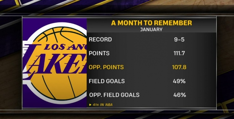 賽前轉(zhuǎn)播方分享了一組數(shù)據(jù):湖人在一月份戰(zhàn)績(jī)?yōu)?勝5負(fù),場(chǎng)均得到111.7分,失分107.8分(聯(lián)盟第四少),投籃命中率49%,對(duì)手投籃命中率46%。