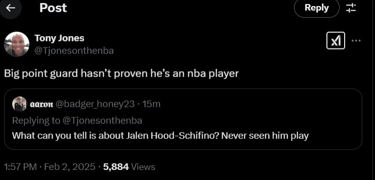 記者Tony Jones回復(fù)道:“高大的控球后衛(wèi)(198cm)還未能證明自己具備NBA球員的實(shí)力。”