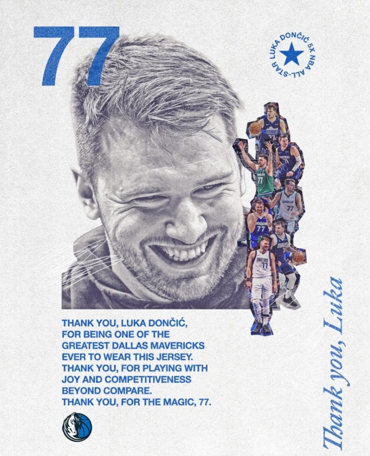 在海報上官方寫道:“謝謝你,盧卡-東契奇。你是達拉斯獨行俠隊史最偉大的球員之一。謝謝你帶著快樂和無與倫比的競爭力打球。謝謝你,盧卡魔法,77。”