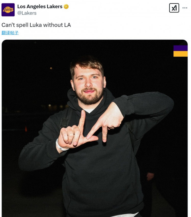 湖人官方曬出了他比“LA(洛杉磯簡稱)”手勢的照片,寫道:“少了LA(這兩個字母)是拼不出Luka(盧卡)的?!?/p>