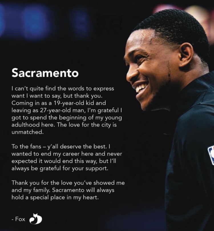 致球迷們,你們理應(yīng)得到最好的。我本想在這里結(jié)束職業(yè)生涯,從未料到會(huì)以這樣的方式離開,但我會(huì)永遠(yuǎn)感激你們的支持。感謝你們給予我和我家人的愛。薩克拉門托在我心中永遠(yuǎn)有一個(gè)特殊的位置。