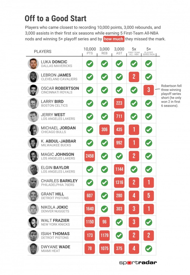 2月4日訊 今天,數(shù)據(jù)專家Todd Whitehead曬出了東契奇的一項數(shù)據(jù)紀錄。在生涯前6個賽季中,東契奇至少得到10000分、3000籃板、3000助攻,且5次入選年度最佳陣容一陣+贏下至少5個季后賽系列賽,是歷史唯一。在曬出的圖片中,Todd Whitehead標出了接近這一點但沒達到的球員,比如詹姆斯其他條件都夠,但一陣數(shù)差2次。 本文標簽: NBA 籃球 湖人 東契奇
