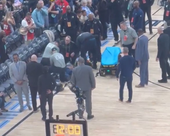 據ESPN記者Michael C. Wright報道,因場邊發(fā)生緊急醫(yī)療情況本場比賽被迫暫停,急救人員目前正在為一位坐在場邊的觀眾進行心肺復蘇。