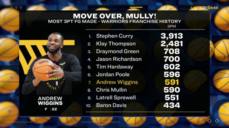 據(jù)統(tǒng)計,本場過后維金斯升至勇士隊史三分命中數(shù)榜單第7位。具體排名如下:
