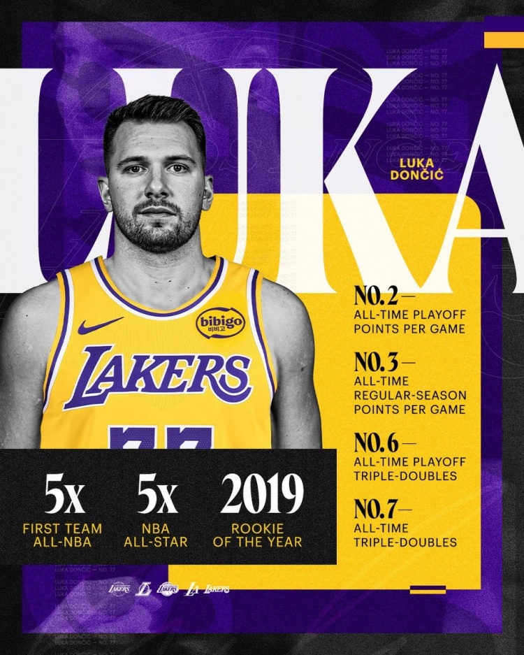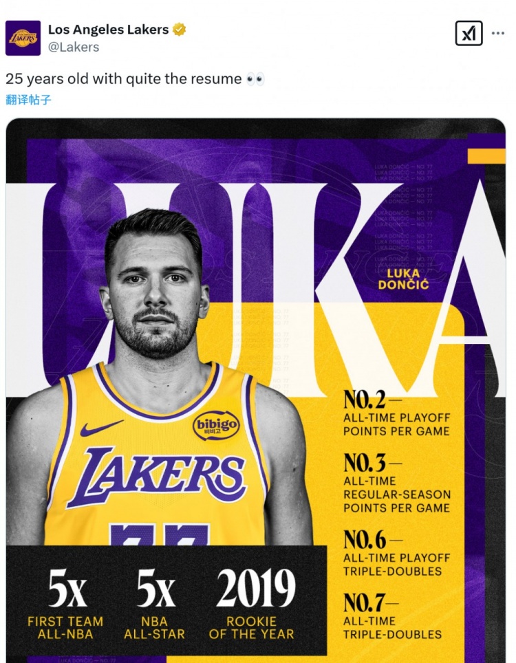 - 25歲!湖人曬東契奇履歷:5次一陣&5次全明星 季后賽場均30.9分