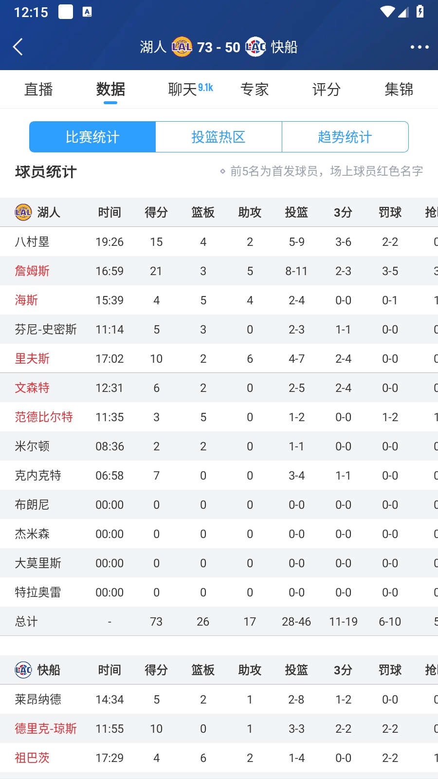詹姆斯老當(dāng)益壯21分&湖人全民皆兵 湖人半場轟73分領(lǐng)先快船23分