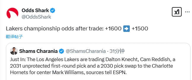 博彩網(wǎng)站Odds Shark轉(zhuǎn)發(fā)了這則消息,并寫(xiě)道:“湖人冠軍賠率從+1600(押100若中連本帶利返1700)變?yōu)?1500(押100若中連本帶利返1600)?!?/p>
