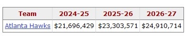 亨特本賽季至今為老鷹出戰(zhàn)36場(chǎng)比賽,場(chǎng)均18.9分3.8籃板1.4助攻。他的合同將在2026-27賽季到期,具體薪資情況如下: